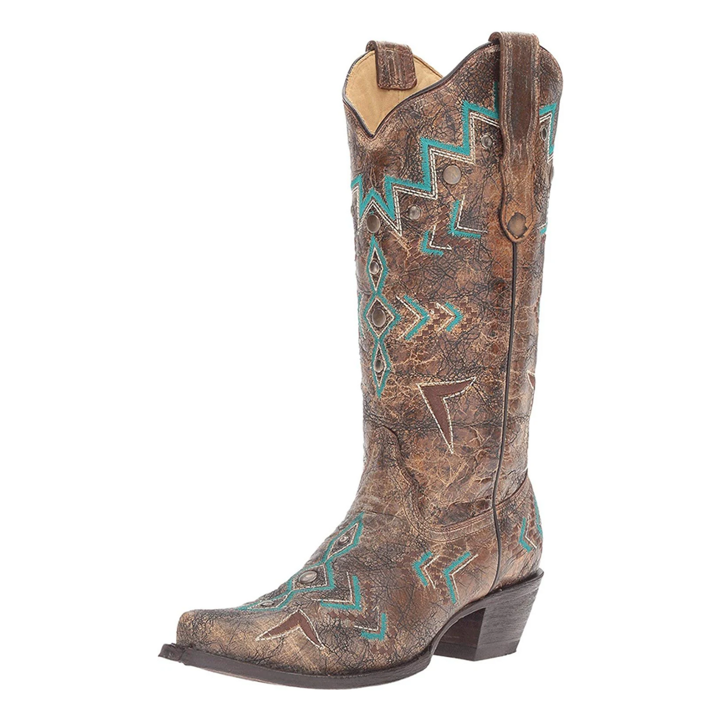 The Corral Boots Women's Turquoise Embroidery Western Boot features a rich brown leather construction with carefully placed turquoise embroidery for a subtle Southwestern twist. The embroidery accents the shaft and vamp without overpowering the design, offering a look that’s stylish yet understated. With a snip toe and handcrafted construction, this boot is ready for anything from rodeo nights to everyday wear.