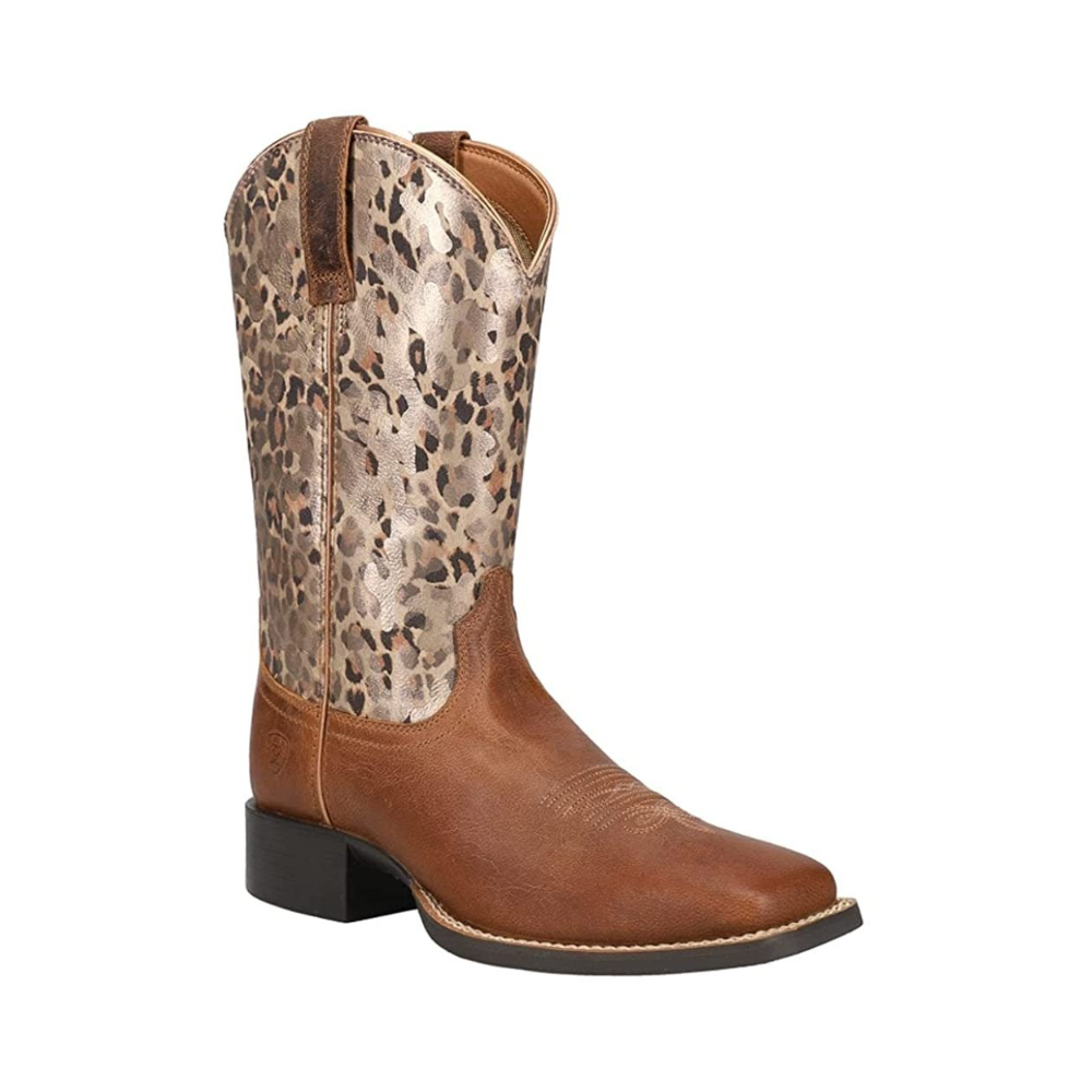 The Ariat Women's Round Up Square Toe Western Boot features a bold leopard-print shaft paired with a rich full-grain leather foot for a head-turning look that doesn’t sacrifice function. With a cushioned insole and a flexible outsole, it’s ready for long hours in the saddle or out on the town.