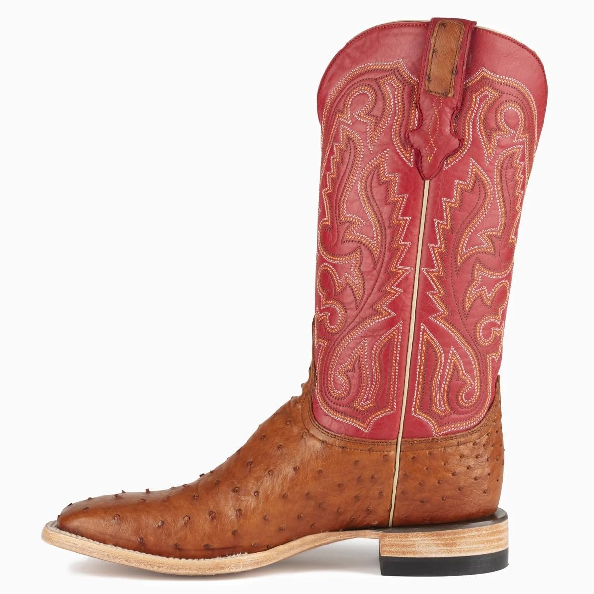 A vibrant red shaft meets a rich cognac full-quill ostrich foot, delivering a perfect mix of bold style and premium craftsmanship. Built with a square toe and stockman heel, these boots are as practical as they are eye-catching. The double welt stitch adds durability, while the supple ostrich leather provides a comfortable fit that molds to your foot over time. Whether you’re working cattle or stepping out for the night, these boots make a statement every time you pull them on.