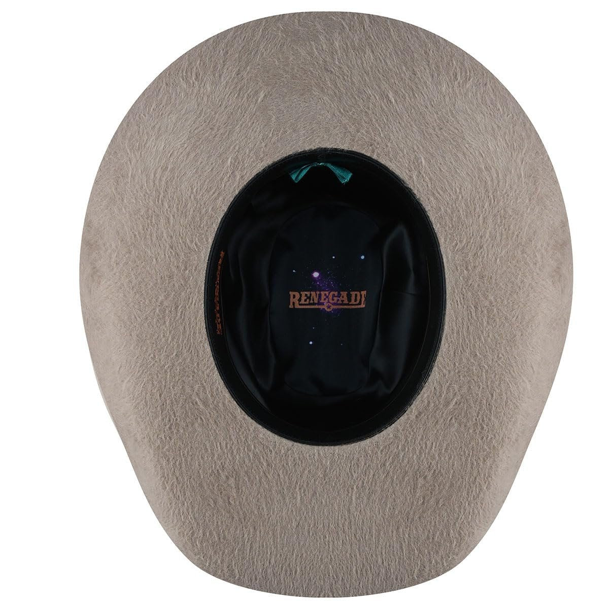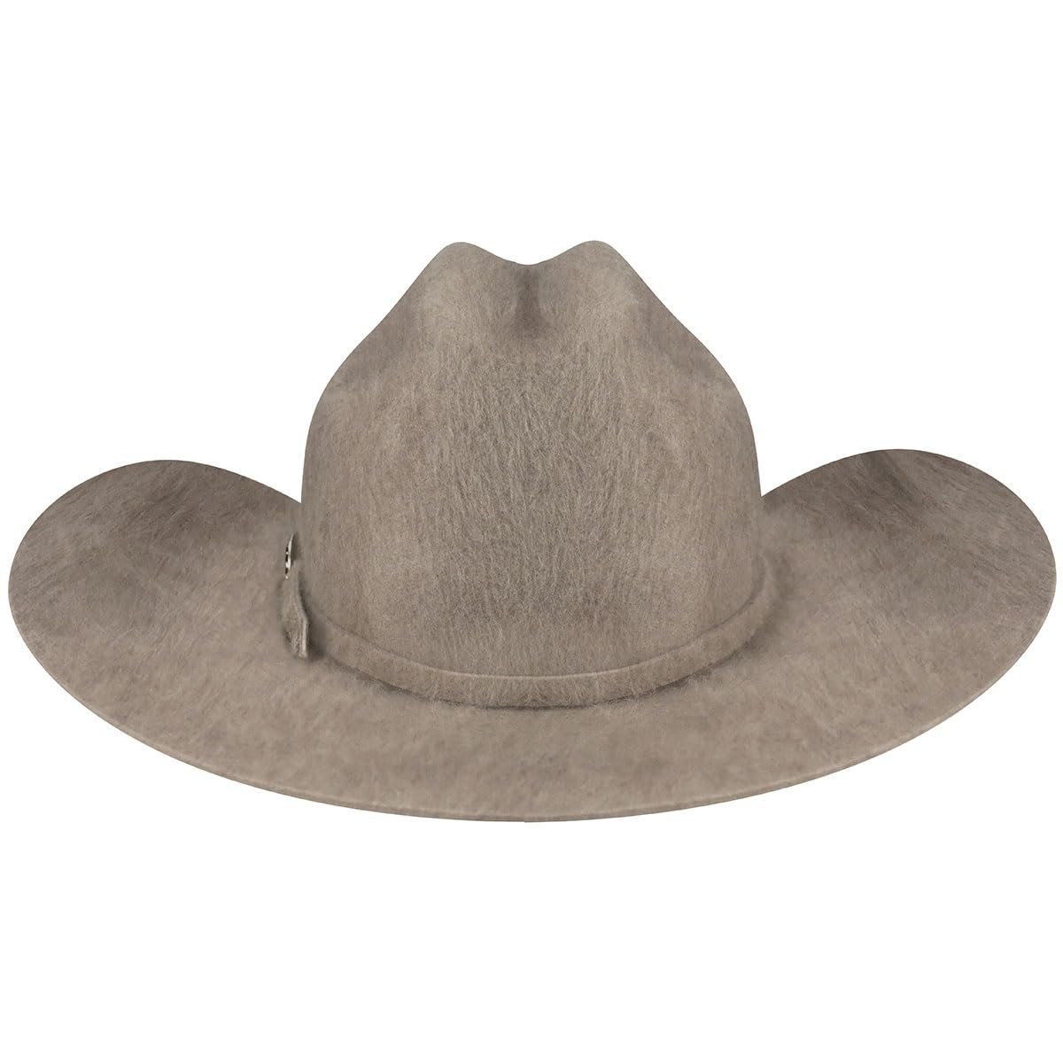 Hand-crafted in the USA, it features a 4 1/2" Rodeo crown and 4 1/4" brim. The grizzly finish gives it a hair-like look without fur. It is tastefully trimmed with a self-felt band and a decorative Concho.