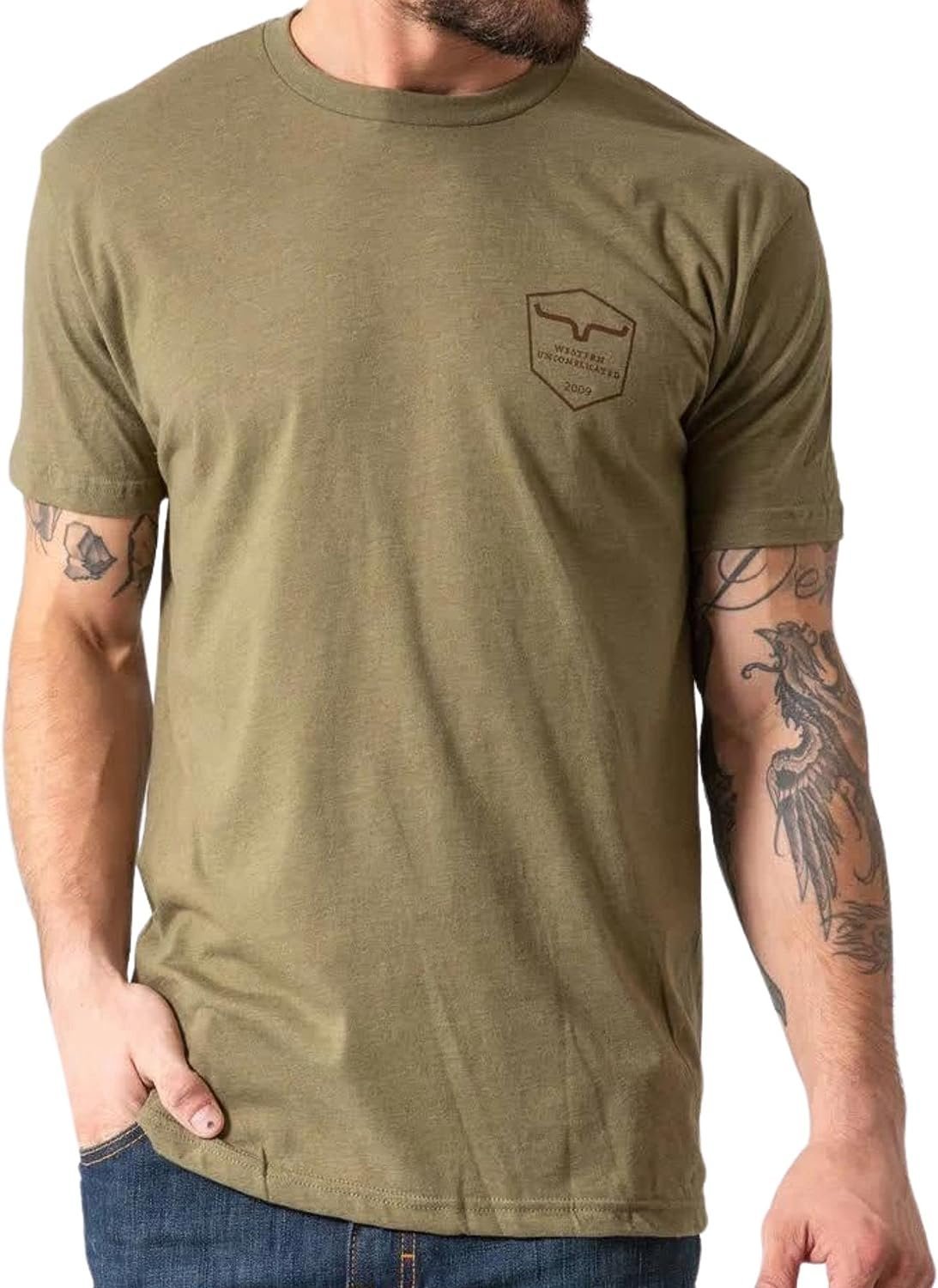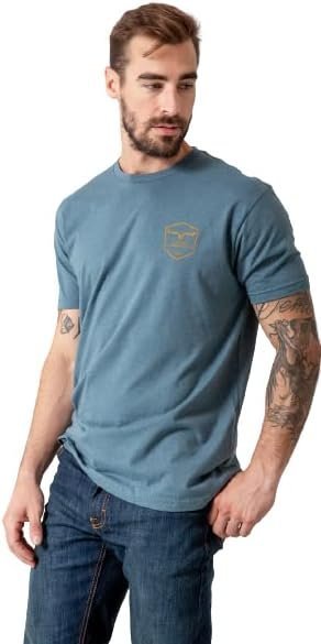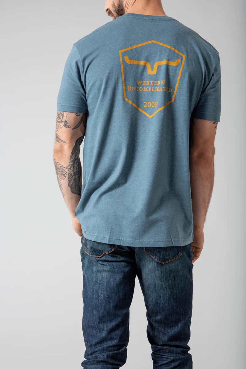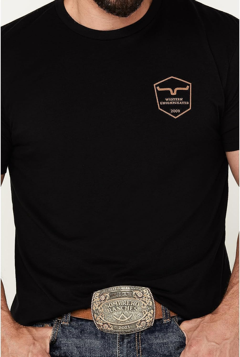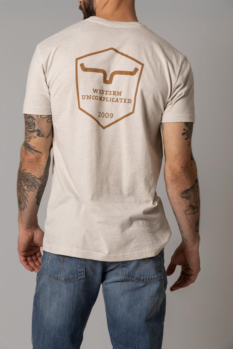 The Kimes Ranch Men's Shielded Trucker T-Shirt keeps it classic with soft, breathable cotton blend comfort—but adds a bold graphic that stands out from the crowd. Featuring the Kimes Ranch horned logo framed in a rugged hexagon with "Western Uncomplicated 2009" text, it's a nod to hardworking roots and modern Western style. From feed runs to fairgrounds, this one’s got your back—literally.