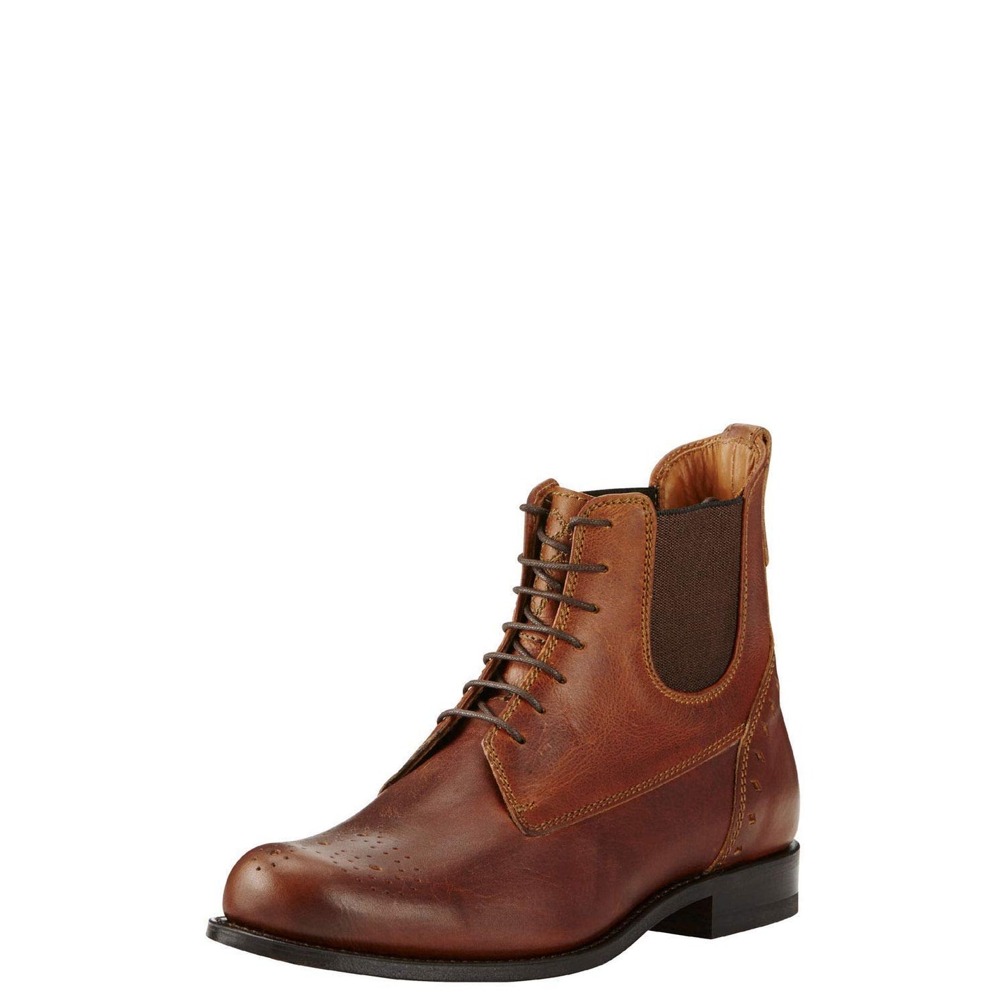The Ariat Women's Pedrena Firewood Ankle Boot is a sophisticated low-cut bootie crafted in Spain by fourth- and fifth-generation shoemakers. Designed as a modern twist on the classic English paddock boot, it features premium full-grain leather with intricate perforated detailing on the heel. Built for all-day comfort and style, it includes a removable cushioned footbed, an integrated cork/rubber layer that molds to your foot, and a leather outsole with TPU for added shock absorption and slip resistance.
