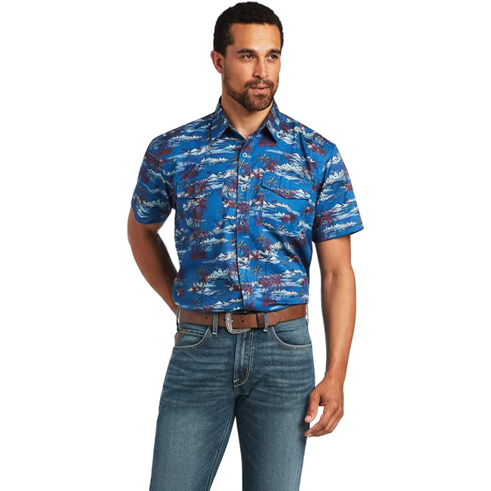 The Ariat Men's VentTEK Western Fitted Shirt in Island Print brings together island-inspired design and high-performance features. Whether you're wrangling cattle or relaxing at a backyard BBQ, this men's Western shirt keeps you cool with breathable mesh panels and moisture-wicking fabric. The fitted cut offers a modern, streamlined look while UPF 40 protection and odor-fighting tech have your back all day long.
