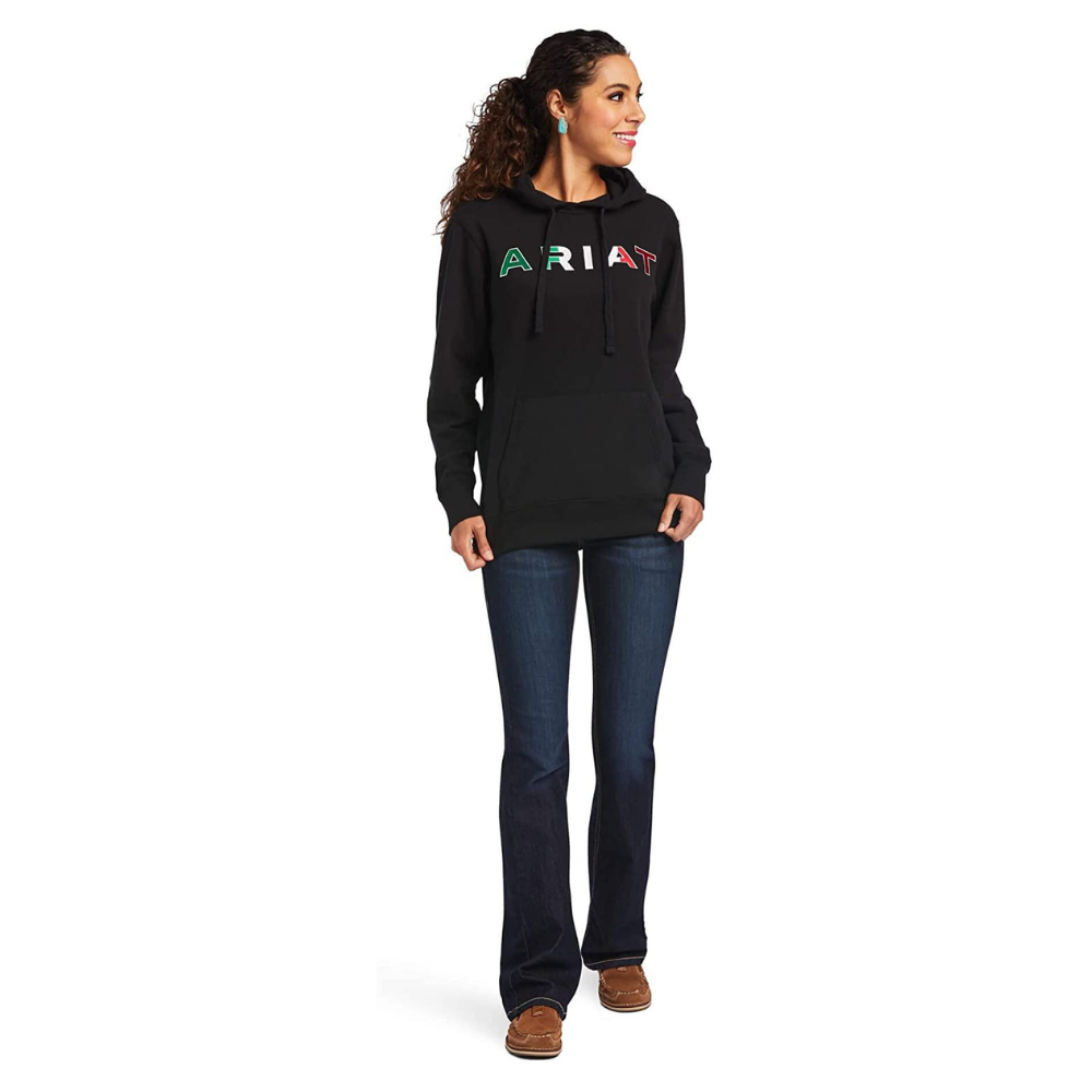The Ariat Women's Mexico Hoodie is crafted from a soft cotton-poly fleece blend that’s perfect for layering on cool days. Featuring a large kangaroo pocket and an embroidered Ariat® logo inspired by Mexican heritage, it’s a standout piece that keeps things warm and casual whether you're heading to the barn or relaxing at home.